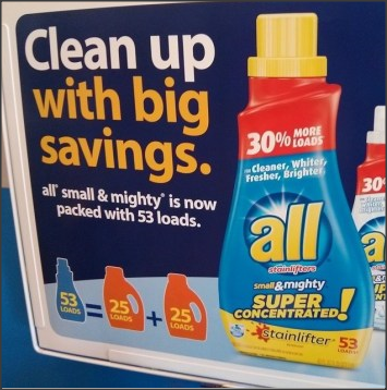 The previous laundry detergent size could wash 25 loads. The new, larger size laundry detergent can clean 53 loads. According to the equation on the ad, 25 + 25 = 53, or roughly double the number of loads for the new size. Seems like the new size is a better deal than the old one… until you notice another number on the bottle.