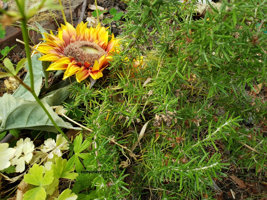 You may encounter a surprise, such as this flower. Someone added color by placing bright orange and yellow flowers in the garden. Some of the flowers in the garden were real. Others were fabric. Both types were like several small suns.
