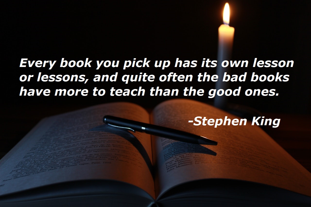 “Every book you pick up has its own lesson or lessons, and quite often the bad books have more to teach than the good ones.” – Stephen King, a.k.a. “The King of Horror” Today we have a few words of wisdom to share with you, someone who reads and writes. Yes, you are “someone whoContinue reading “Read Bad Books with Bad Writing”